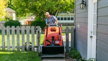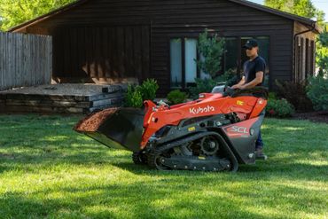 We use a new Kubota SCL1000 stand-on compact loader (a.k.a. mini skid steer). This unit boast a narrow body (less than 36" wide) to fit through small gates and tight openings. Despite being extremely narrow, it offers a very light footprint (4psi) thanks to its wide tracks. This ensures minimal ground disturbance. The SCL1000 is capable of lifting 1,000 pounds!